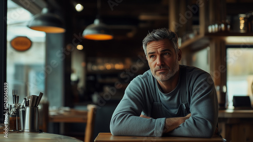 man, eatery, thoughtful, grey hair, atmosphere, wooden table, coffee, calm, portrait, service, natural light, inspiration