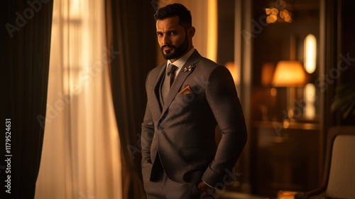 A groom in a stylish setting, standing confidently in formal attire, with warm lighting and a sophisticated atmosphere that highlights his elegant wedding preparation.