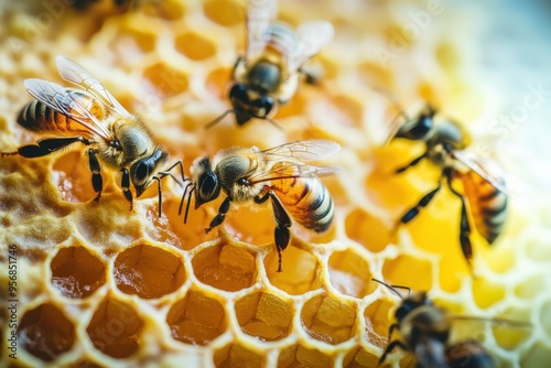 A group of bees are gathered around a honeycomb