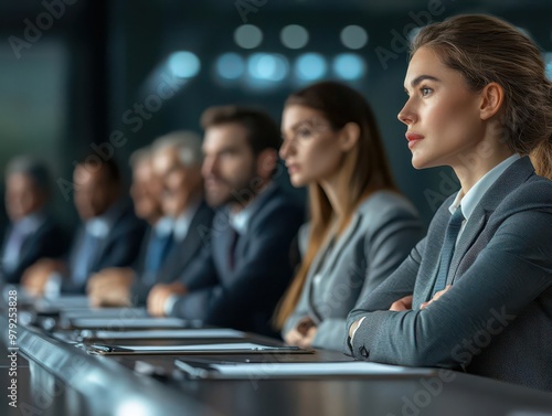 A group of business professionals in suits sit in a row, looking ahead with determination.
