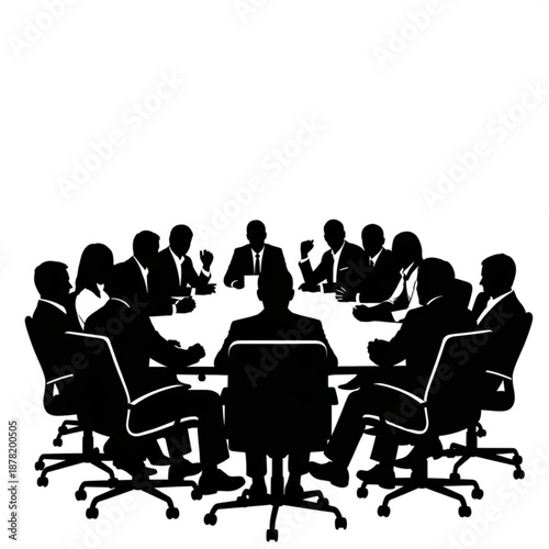 business, meeting, conference, table, silhouette, black, people, group, discussion, planning, strategy, team, collaboration, communication, office, work, professional, leadership, management, silhouette, board, room, sitting, seated, talking, decision, making, brainstorming, idea, sharing, partnership, company, organisation, round, chair, furniture, graphic