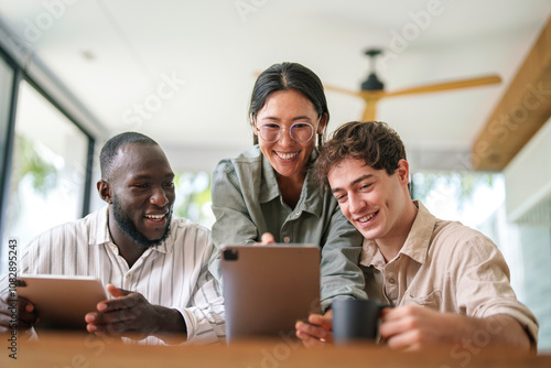 A group of cheerful young adults engage in teamwork at a modern office, with diverse businessmen and businesswomen focused on a tablet, dressed in casual attire, suggesting productive collaboration.
