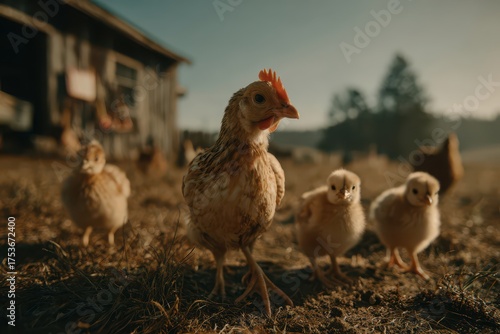chicken, chick, farm, rural, agriculture, poultry, animal, farm animal, farming, bird, domestic, young, nature, countryside, animal husbandry, barnyard, shed, hen, sulk, family, yellow, farmland, grazing, sunny, dawn, natural light, brown, small, cute, grass, ground, yard, avian, feathered, farm animal