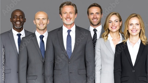 A group of diverse business professionals smiling in formal attire on gray background