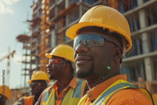 A group of diverse construction workers, wearing hard hats and high-visibility vests, working together to build a tall skyscraper.