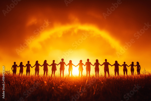 A group of diverse friends holding hands in a circle under a golden sunset, their faces glowing with smiles, symbolizing unity and joy in friendship