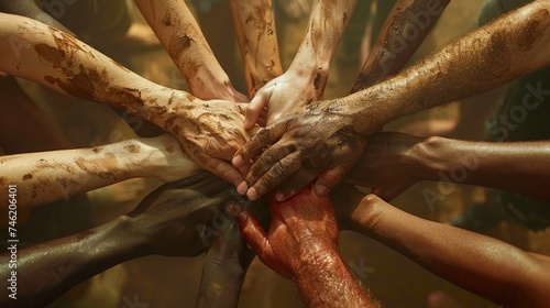 A group of diverse hands come together in a symbol of unity and solidarity, as the first rays of dawn cast a warm golden light upon their bond