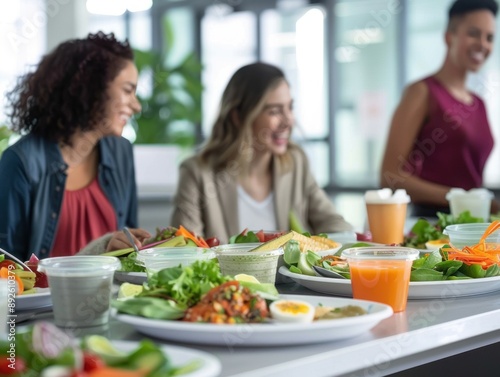 friends, lunch, healthy, food, fresh, salad, vegetable, table, office, dining, happy, laughing, eating, group, casual attire, together, enjoying, eatery, meal, delicious, colourful, vibrant, alimentary, lifestyle, social, gathering, workspace, modern, interior, light, bright, natural, positive, friendly, relaxed, comfortable