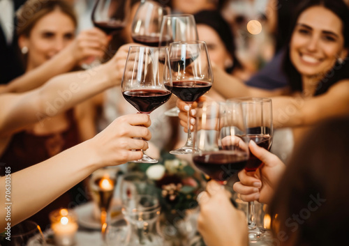 celebration, wine glass, toast, party, friends, gathering, cheer, red wine, socialising, happiness, event, dining, enjoyment, festive, group, people, together, occasion, fun, leisure, lifestyle, woman, smiling, alcohol, drink, meeting, table, eatery, joyful, dinner, casual attire, adult, bonding, friendship, reception, tableware, closeup, nightlife, hand, wine tasting, entertainment, wine glass