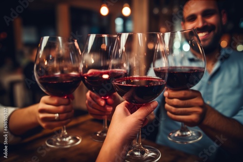friends, toasting, red wine, eatery, cosy, gathering, joyful, celebration, closeup, cheer, goggles, wine, group, social, intimate, ambience, happiness, enjoyment, dining, toast, evening, togetherness, companionship, friendship, leisure, lifestyle, camaraderie, conviviality, party, festive, happy hour, socialising