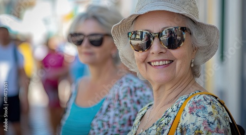 A group of happy elderly women on vacation, walking through the streets in their colorful and sunglasses