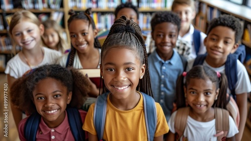 A group of happy multiethnic children with books in the school library. Diverse Kids at school