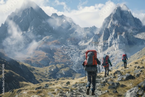 A group of hikers traversing through a challenging mountain landscape with backpacks and hiking poles.