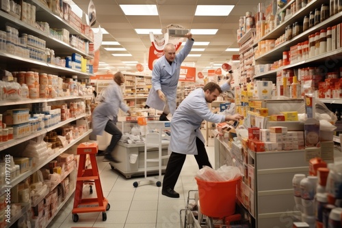 A group of individuals navigating through a crowded store while shopping for everyday items, Hospital staff stocktaking in pharmacy, AI Generated