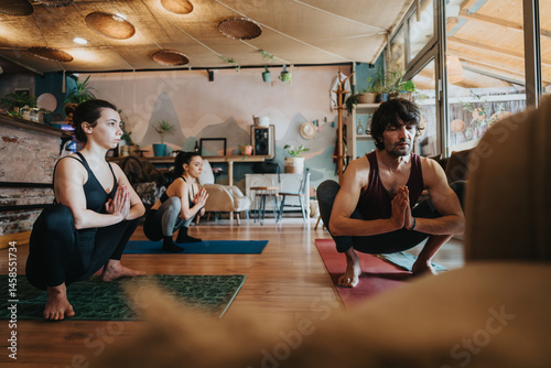 A group of individuals of various ages performing yoga poses in a cozy and inviting home yoga studio, emphasizing mindfulness, flexibility, and relaxation in a supportive atmosphere.