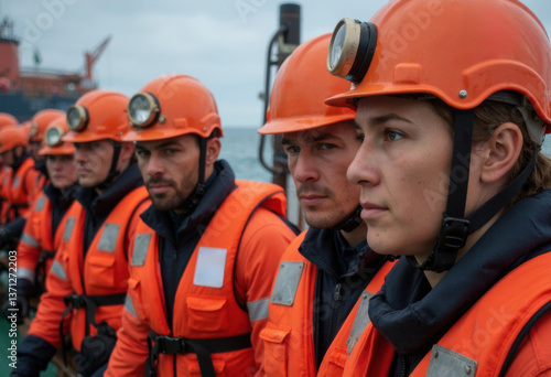 maritime, men at work, safety, gear, helmet, orange, team, sharpened, determination, vessel, cloudy, industrial, ocean, sea, labor, crew, professional, teamwork, environment, ship, nautical, attire, equipment, portrait, serious, expression, coast, transportation, industry, hard hat, oceanic, marin, responsibility, alertness, shipboard, collective, oneness, resilience, adventure, exploration, duty