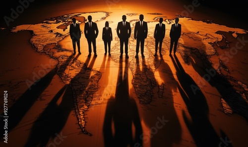 A group of men stand in front of a globe, with their shadows cast on the ground. Concept of power and authority, as the men are dressed in suits and appear to be in a position of leadership