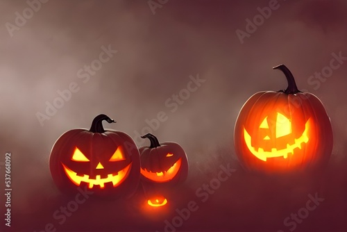 A group of misshapen pumpkins leer menacingly from a dark corner, their jagged teeth bared in evil grins. flickering candles inside their hollow insides provide an eerie glow, and long strands of cobw