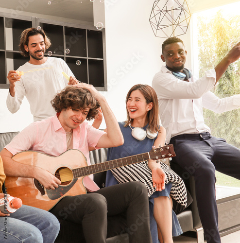 A group of multiracial teenagers is playing guitar and singing a song together while happily having fun blowing bubbles at the afternoon party. Recreational activity and celebration concepts.