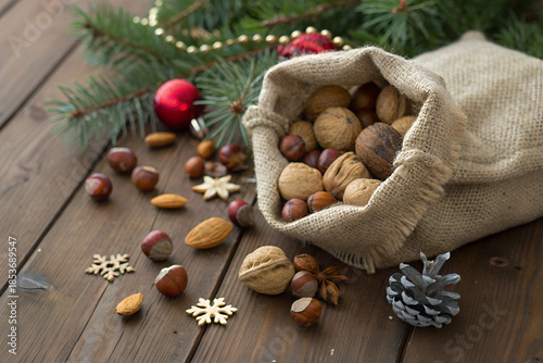 A group of organic walnuts and hazelnuts mixed with cinnamon spices and fresh Christmas cookies creates a healthy natural snack on a brown wood background