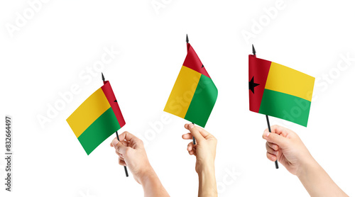 A group of people are holding small flags of Guinea-Bissau in their hands.