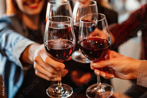 A group of people are holding up wine glasses in a celebratory manner, generative ai.