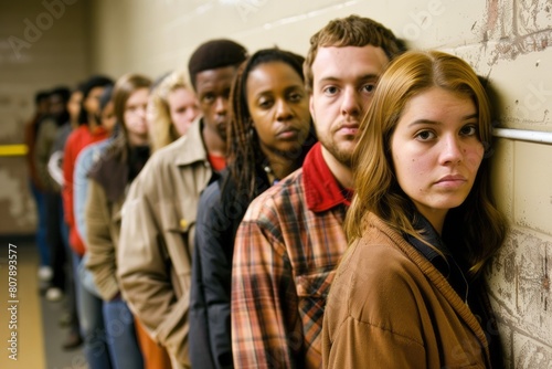 A group of people of different races and nationalities stand against a wall expressing depression and emotional pain