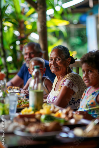 group, people, sitting, around, table, plate, food, family, meal, dining, children, adult, smiling, joy, togetherness, nature, tropical, relaxation, leisure, elderly, woman, wearing, white, blouse, big, smile, face, behind, older, man, 2, young, 1, whom, next, covered, tablecloth, drink, background, blurred, setting, tree, plant, mood, happy, relaxed