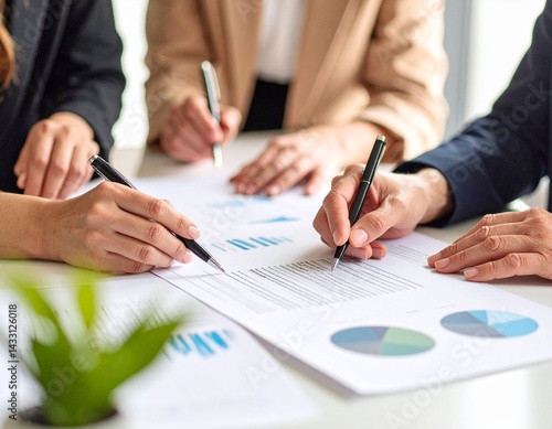 A group of professionals collaborating on documents with charts, focusing on teamwork and decision-making in a modern office setting.
