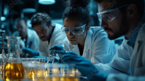 A group of scientists are working in a lab, with one of them wearing a lab coat