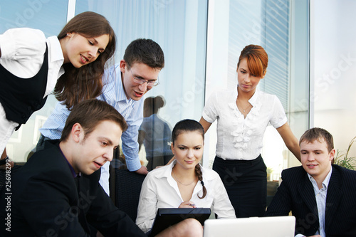 A group of six business persons is working with a laptop