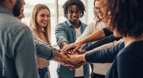 group, happiness, collaborative, teamwork, team, connection, support, friendship, togetherness, collaboration, positive, smiling, individual, their, hand, stacked, together, circle