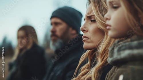 A group of somber individuals, including a child, sit in reflection amidst a serene backdrop, encapsulating deep emotions and unspoken connections between loved ones.