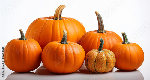 A group of various-sized pumpkins with rich orange hues, isolated on a white background, showcasing their smooth textures and unique shapes, studio lighting, lanscape, photography.