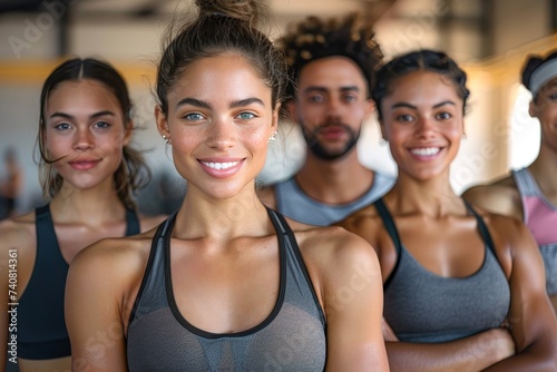 A group of vibrant individuals gather together, showcasing their joyful spirits through beaming smiles and stylish clothing choices, with one woman proudly displaying her toned muscles in a sleeveles