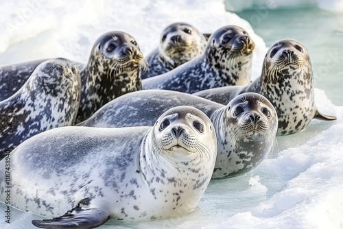 A group of Weddell seals lounging on sea ice, occasionally slipping into the water for a swim