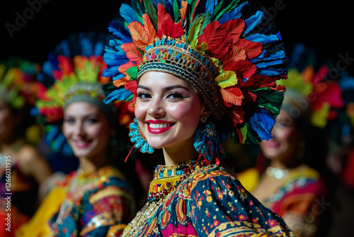 group, woman, dressed, brightly, coloured, costume, feather, indigenous, cultural, traditional, vibrant, festival, celebration, dance, smiling, joyful, ethnic, ornate, young, woman, wearing, head, looking, camera, made, up, multiple, layer, different, red, orange, yellow, blue, green, purple, mexican, blouse, necklace, lipstick, lip, hair, styled, bun, background, similar, mood, lively
