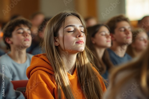 meditation, young, people, group, calm, peace, mindfulness, sharpened, oneness, relaxation, sunlight, casual attire, setting, harmony, youth, serene, concentration, calmness, practice, orange, hoodie, gathering, connection, spirituality, health, balance, wellness, indoor, lifestyle, happiness, awareness, mood, stress, therapy, growth, learning, education, student, togetherness, community, bonding, breathing, inner, light, collective, ai, generative, illustration