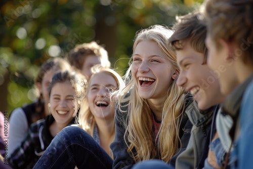 A group of young people are sitting together and laughing. Scene is happy and lighthearted