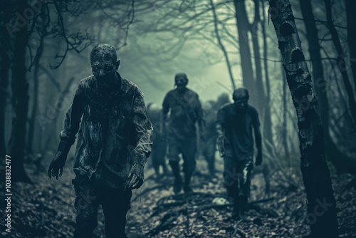 A group of zombies walk through a forest