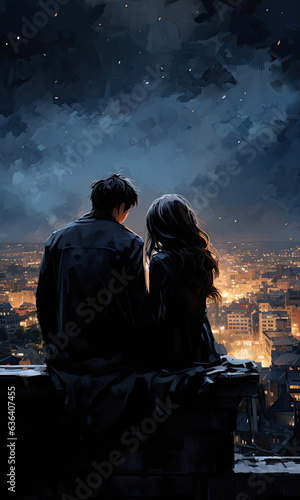 A guy and a girl sit on the roof and look at the night city sparkling with lights. AI generated