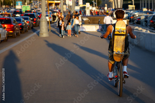 A guy in headphones with a skateboard behind his back rides a bike around the city