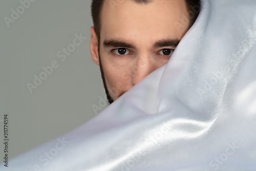 A guy portrait hiding behind a cloth white. Handsome man with a beard covered with white shiny fabric