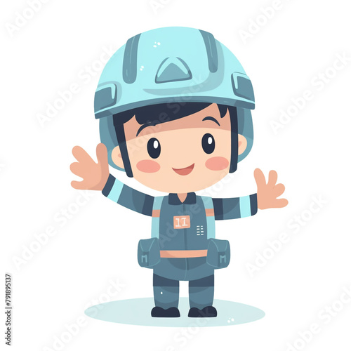 a guy wearing an overall and a security helmet, he's very happy and saying hi, character, illustration, kawaii сreated with Generative Ai