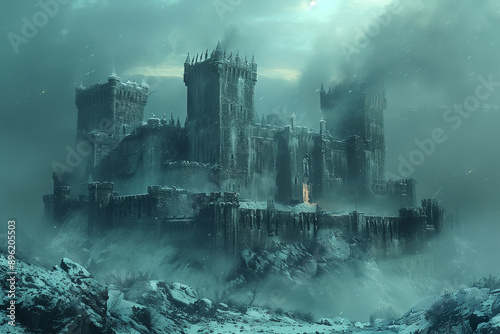 A Hailstorm Battering a Medieval Castle at Twilight: Dramatic Weather Art