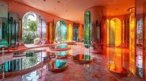 interior, hallway, mirror, glasses, colourful, design, architecture, modern, art, abstract, contemporary, decorative, style, artwork, room, building, wall, floor, pattern, decor, high-coloured, installation, bright, shape, opulent, glassy, shiny, luster, pink, green, orange, teal, light, creative, space, home, house