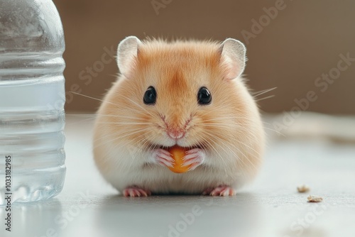 A hamster trapped in a tiny plastic cage, equipped solely with a water bottle and food, symbolizes the constraints of its environment.