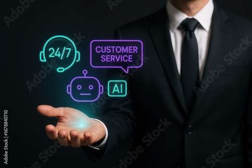 A hand displays 24/7 customer service, represented by futuristic icons, highlighting the use of AI in modern communication.