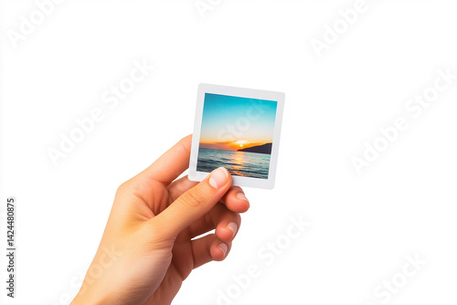 A hand gently holding a sunset beach photo, capturing the warm golden hues and tranquil ocean scene, a vivid memory held dear.