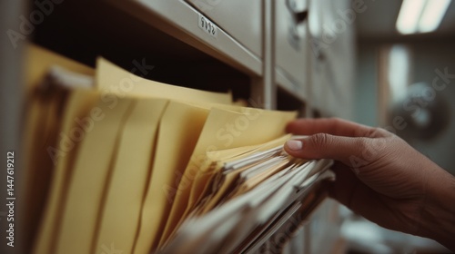 A hand gently peruses yellow files in a metal cabinet, evoking a sense of organization and discovery.
